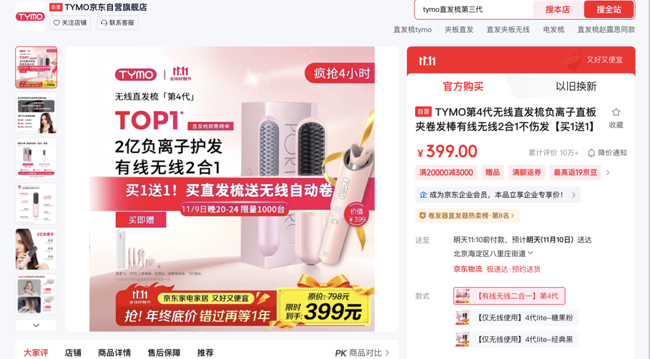 除智能吹风机外,直发梳产品也备受消费者青睐,TYMO第四代无线直发梳,有线无񏍸𴡑,告别电量焦虑,2亿负离子持续输出,快速中和静电,一梳即顺。3档温控,适合各种发质需求,快速塑造顺直、高颅顶、八字刘海等发型。限𿮡折到手�元!现在下单即赠无线自动卷发棒,加入店铺会员还享񀙛年以换代修服务。