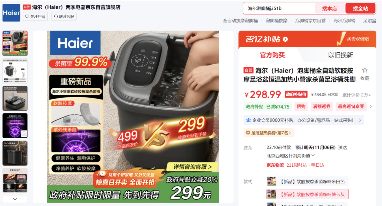 海尔小管家软胶按摩杀菌泡脚桶,让温暖从足底开始蔓延。这款泡脚桶采用全包裹硅胶按摩垫,贴合足弓脚掌,不易磨伤起泡,全自动按摩设计覆盖足底部位,杀菌�.99%,深层洁净更安心。京�.11期间享限时限量补贴立�%,到手价仅�元,买贵双倍赔,还送足浴包。在这个秋冬时节,给疲惫的双脚一个温暖的拥抱,让每一天都从足底舒适开始。