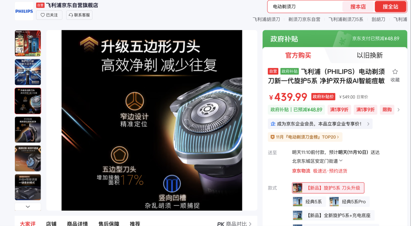 男士护理也不容忽视。飞利浦电动剃须刀新一代旋𽩭系采用五边形刀头,增加接触面�%,360度灵活刀头完美贴合面部轮廓,AI智能调速,舒适减少震感,每分钟切�万次,瞬息全净剃,补贴后预估到手�元,会员下单还�元京豆。
